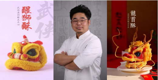 在讲座中,武杨老师分享了他从业近十年来,如何将面塑手艺融入传统中式酥点,并结合中国传统文化,设计制作出形色味兼备的新式酥点的心路历程。他的作品不仅来源于对传统文化的不断探索,更是他对酥点艺术的深刻理解和创新精神的体现。他特别提到,醒狮酥这款点心灵感来自黄飞鸿电影中的舞狮场景,以岭南醒狮为创作元素,是一种非遗文化的跨界融合。