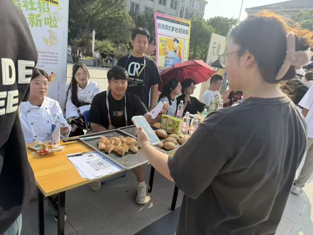 西点社摊位,凭借两样 “王牌美味” 彻底火了——刚出炉的菠萝包外皮脆,咬一口满是黄油香气;金黄的蛋挞内馅嫩滑,热乎劲儿裹着香甜在舌尖散开,引得路过同学纷纷驻足,排起长队只为尝一口这份 “校园限定甜”。