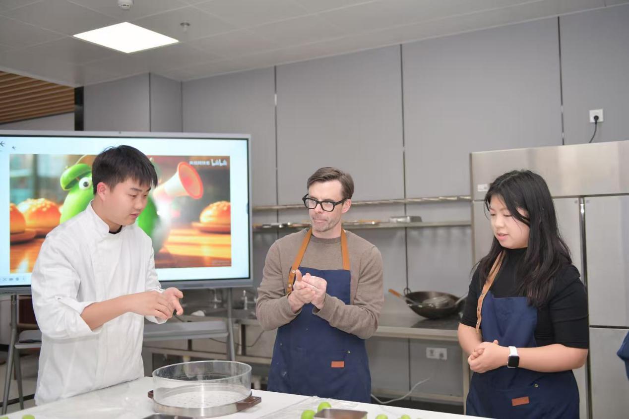学院将思政教育与专业实践、传统文化相结合,在26号楼烹饪与酒店管理学院实训中心开展传统糕点青团制作活动,创新打造“党建+传统文化+专业实训”的思政育人场景,让思政教育既有深度又有温度。活动特别邀请外籍教师Gregory Houser参与体验,让中华传统美食成为跨文化交流的桥梁,同时邀请学院党员教师王博涵现场授课,将青团制作与思政教育、专业技能传授有机融合。讲解青团由来与文化内涵,传递家国情怀;随后手把手指导制作,外籍教师积极参与并创新青团样式,实现跨文化交流与传统美食创新。